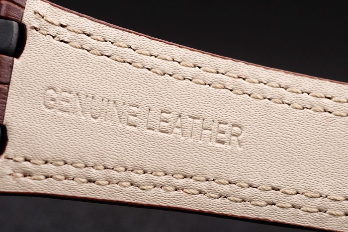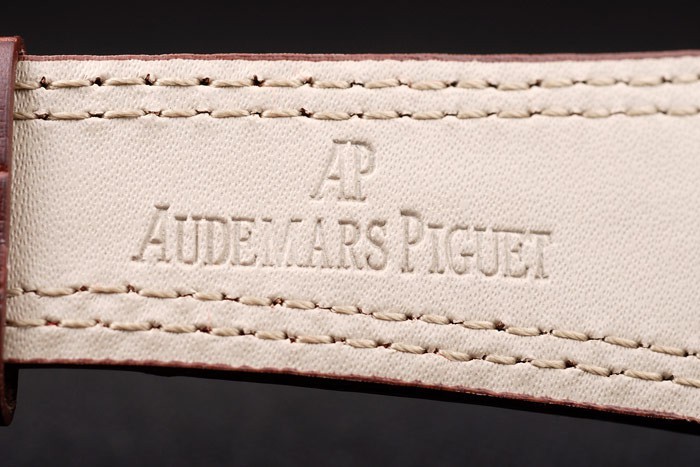 Bracelet: Heat präglade Audemars Piguet brun krokodil läderrem med dubbla röda sömmar och Audemars Piguet graverad jon-klädd fold-in clasp