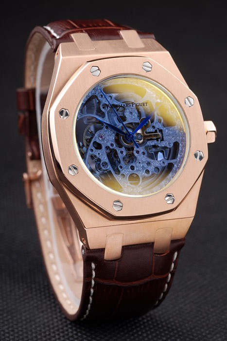 Tillbaka Royal Oak graverad steg-guldpläterade skruvas ned tillbaka med transparent centrum avslöja inre mechanics