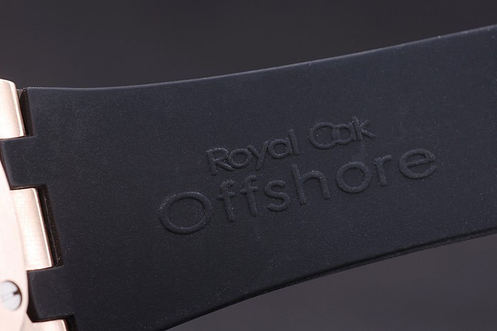 Bracelet: Svart gummiband med värme präglade Audemars Piguet Royal Oak Offshore stämpel och en Audemars Piguet inskriven jon-klädd krok-spänne clasp