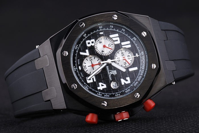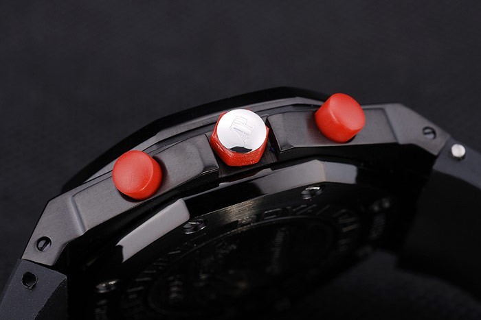 Crown: Rostfritt stål Audemars Piguet logotyp ingraverad röd emalj cutwork krona med två mindre kronorna på vardera sidan om it