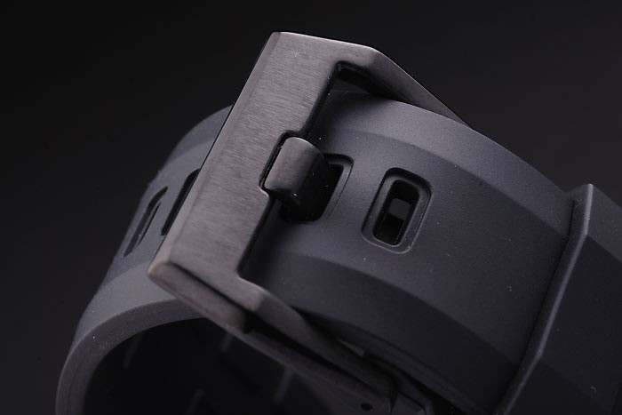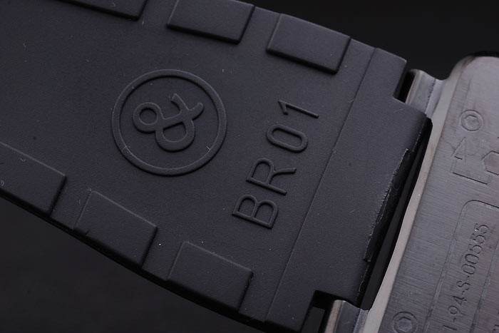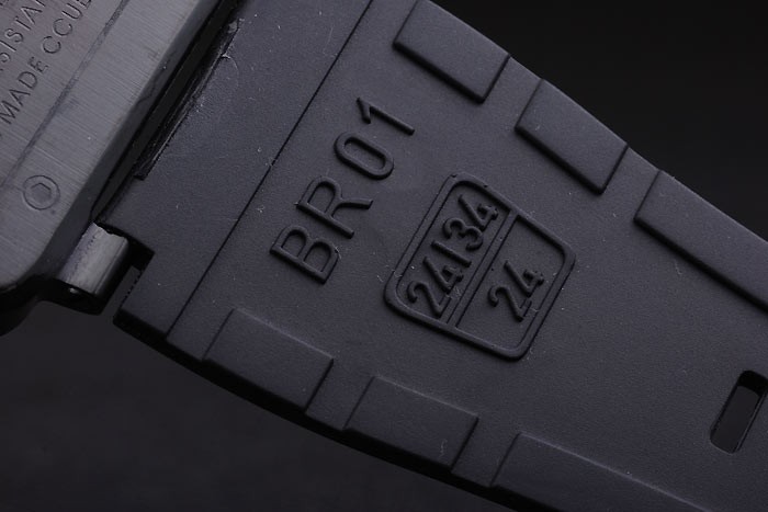 Bracelet: Svart gummiband med värme präglade logo, modellnummer och produkt kod och BR graverad jon-klädd krok-spänne spänne