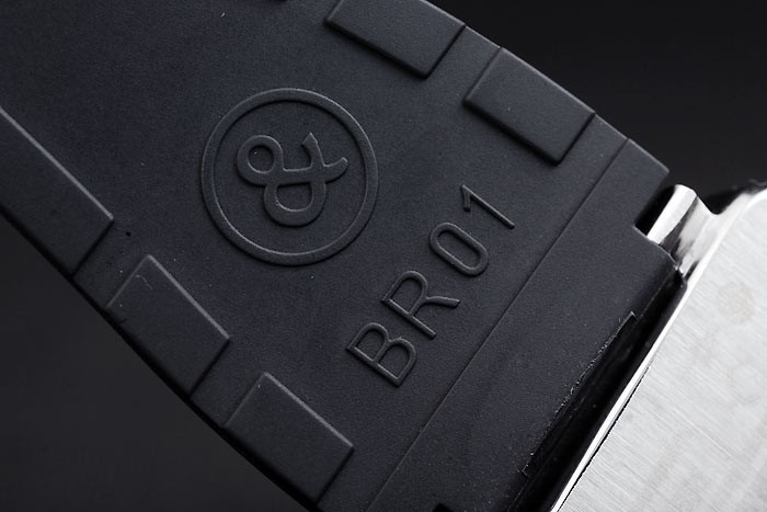 Bracelet: Svart gummiband med värme präglade logo, modellnummer och produktkod och BR graverad borstat rostfritt stål krok-spänne spänne