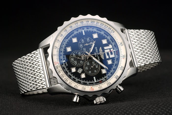 Crown: polerat cutwork rostfritt stål krona med Breitling logotyp och två små runda tryckknapps kronor på ömse sidor av it