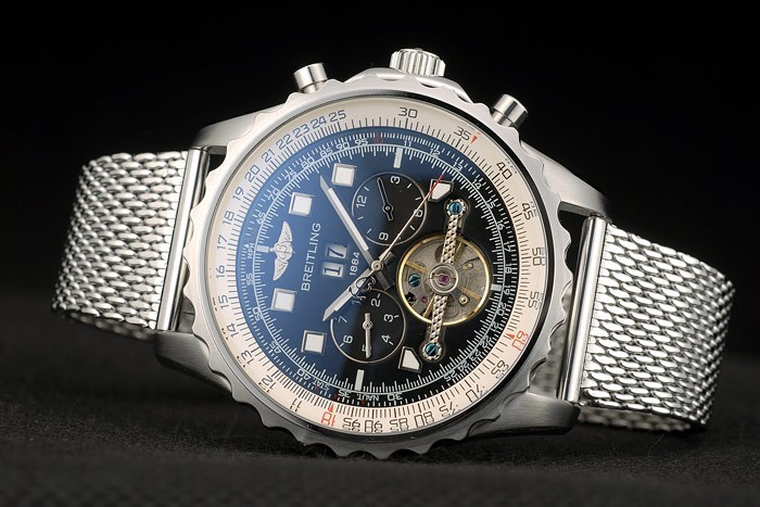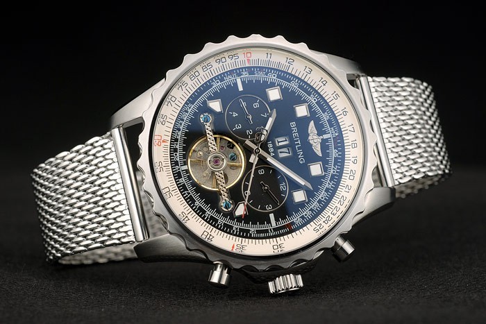 Crown: polerat cutwork rostfritt stål krona med Breitling logotyp och två små runda tryckknapps kronor på ömse sidor om it
