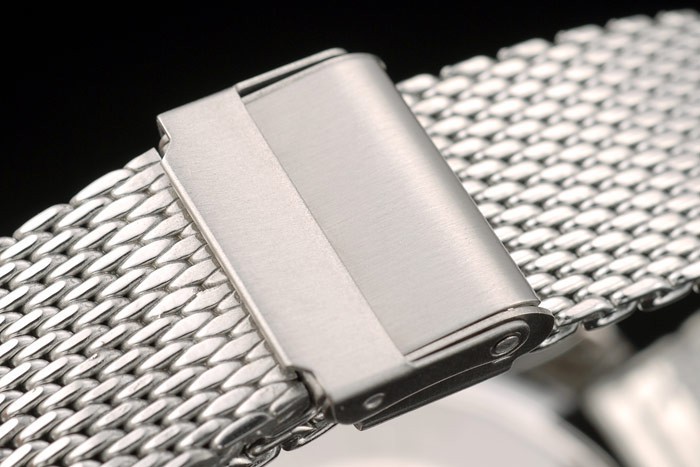 Crown: polerat cutwork rostfritt stål krona med Breitling logotyp och två små runda tryckknapps kronor på ömse sidor av it