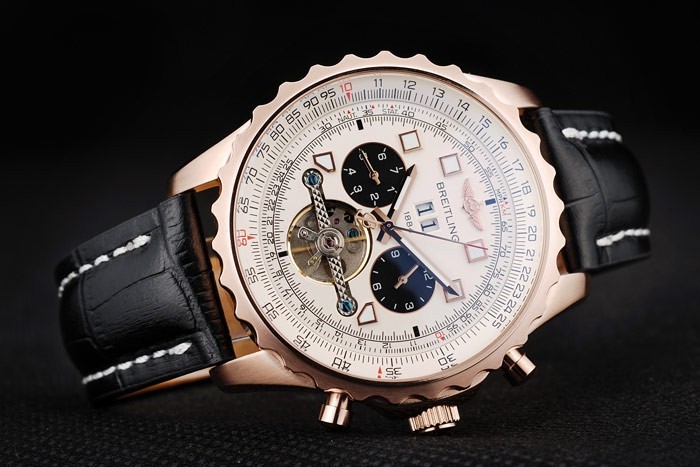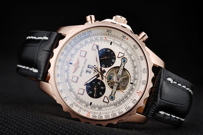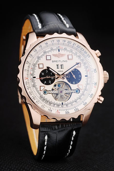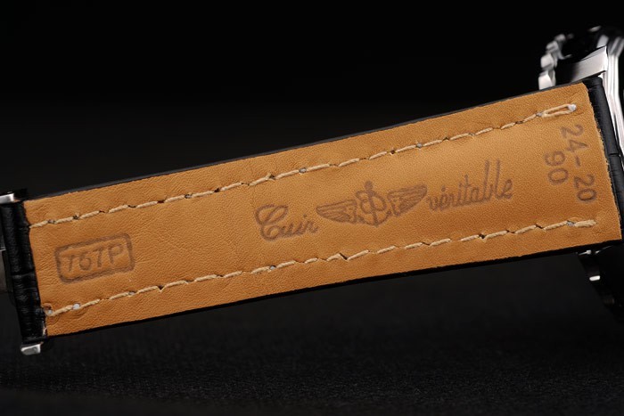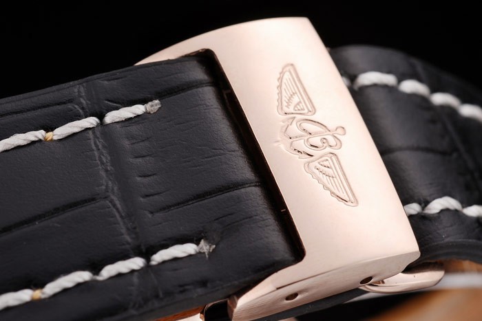 Bracelet: Heat präglade Breitling namn och logotyp svart krokodil läderrem med vit tråd stiching och graverade logotyp rose-guldpläterade vika in clasp