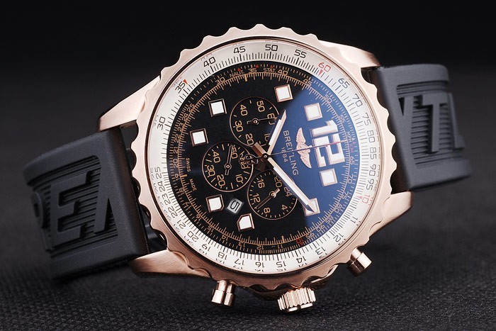Crown: 18k steg-guldpläterade cutwork krona med Breitling logotyp och två mindre rostfritt stål tryckknappskronor på vardera sidan om it