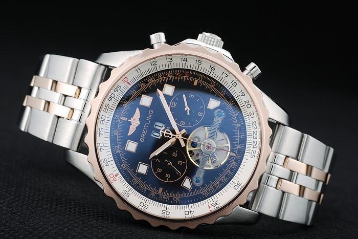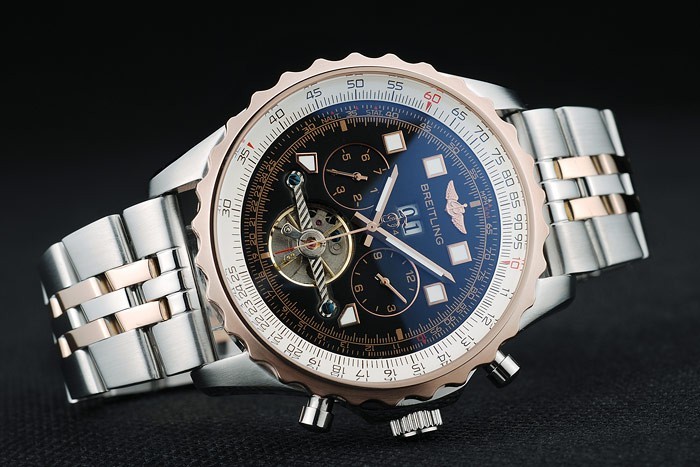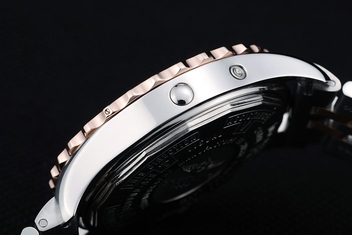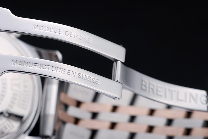Crown: polerat rostfritt stål cutwork krona med Breitling logotyp och två mindre rostfritt stål tryckknappskronor på vardera sidan om it