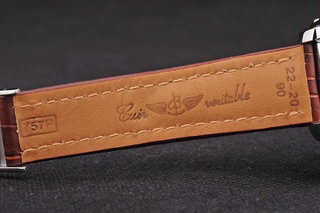 Bracelet: Varm mahogny färgad hög kvalitet läder i en krokodil mönster, med kraftig vit bomull sömmar. Tan inre band präglad med Breitling namn och logotyp, och har en stål spänne stängning.