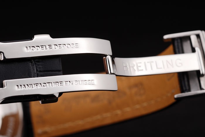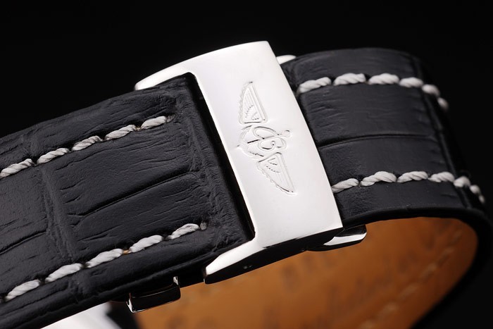 Bracelet: Heat präglade Breitling svart krokodil läder rem med vit tråd sömmar och en Breitling logotyp ingraverad stål utfällbar i clasp