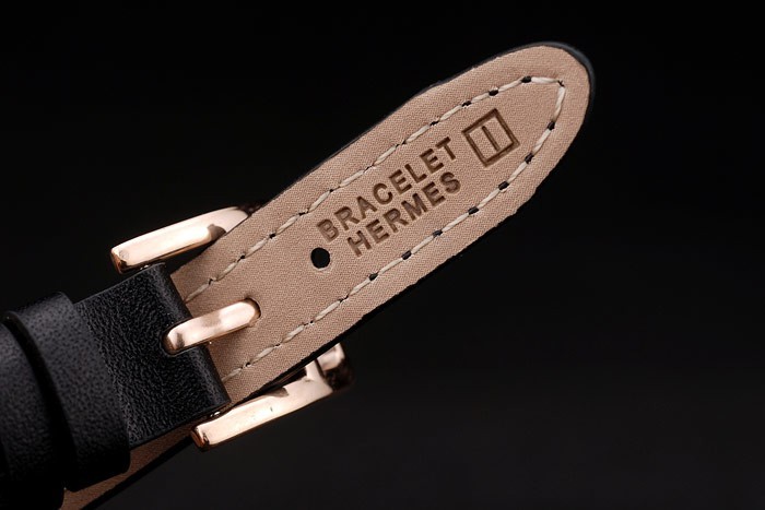 Bracelet: Förlängt svart läderrem med värme präglad stämpel och Hermes Hermes armbandet graverad steg-guldpläterade krok spänne spänne