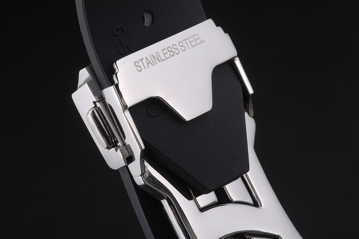 Bracelet: Hublot Geneve värme präglade ribb svart gummiband med Hublot Geneve graverad borstat rostfritt stål tryckKoppling clasp