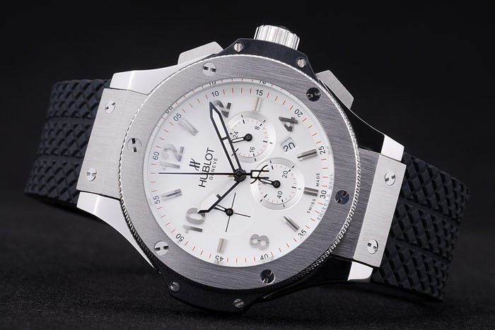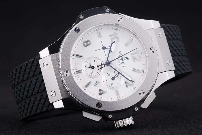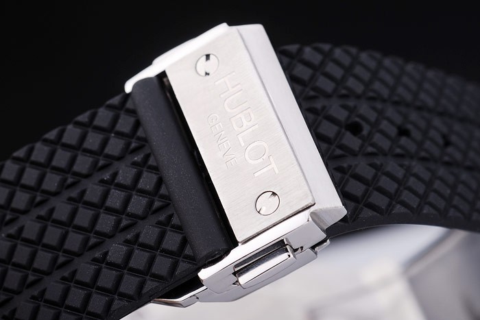 Bracelet: Värme präglad logotyp och Hublot Geneve texturerad svart gummiband med Hublot Geneve graverad rostfritt stål fold-over tryck -release krok clasp