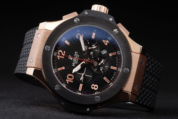 Crown: Cutwork rose-guldkrona med “H” gravyr och två rektangulära tryckknapp kronor på vardera sidan, alla översållad med svart gummi trimmings