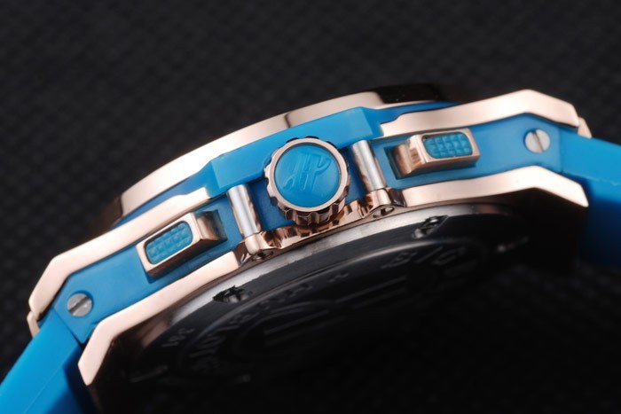 Crown: Cutwork rose-guldkrona med “H” gravyr och två rektangulära tryckknapp kronor på ömse sidor, alla översållad med blå gummi trimmings