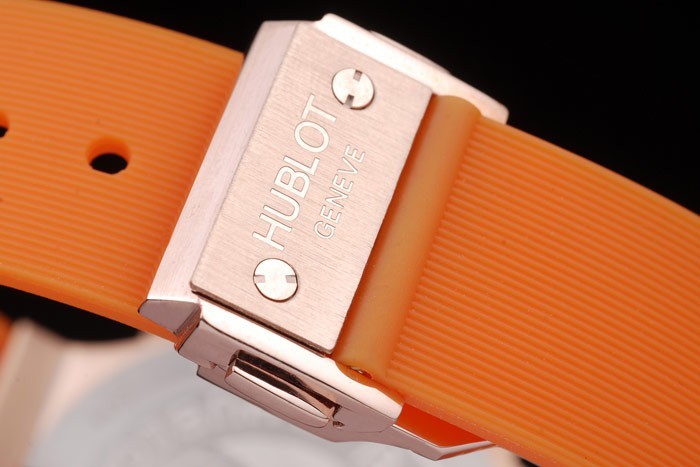 Bracelet: Strukturerad apelsin gummiband med rose-guld tryckknapp krok lås och Hublot engravings