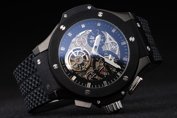 Tillbaka: Rostfritt stål skruvas ned tillbaka med Hublot inskriptioner och transparent centrum avslöjar mekaniken within
