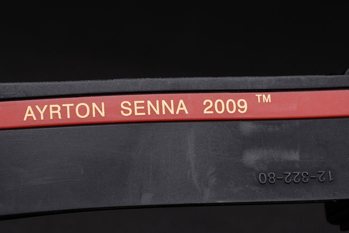 Bracelet: Strukturerad svart gummiband med jon-klädd tryckknapp krok lås, värme präglade gravyr och Hublot Ayrton Senna 2009 inscriptions