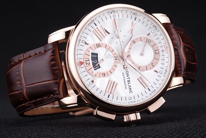 Bracelet rostfritt stål: Heat präglade MontBlanc brun krokodil läderrem med MontBlanc namn och logotyp ingraverad rose-guld flip-over krok clasp