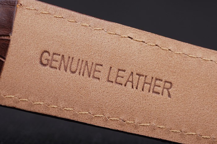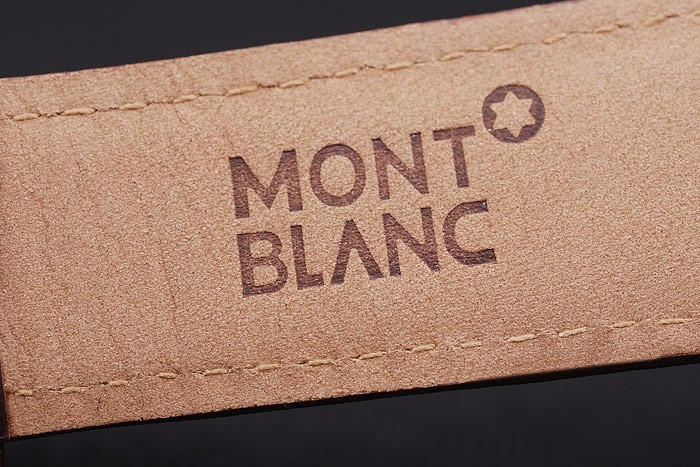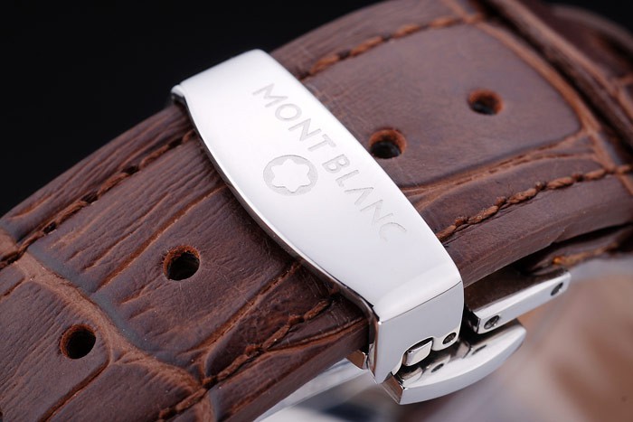 Bracelet: Heat präglade MontBlanc brun krokodil läderrem med MontBlanc namn och logotyp ingraverad polerad rostfritt stål flip-over krok clasp