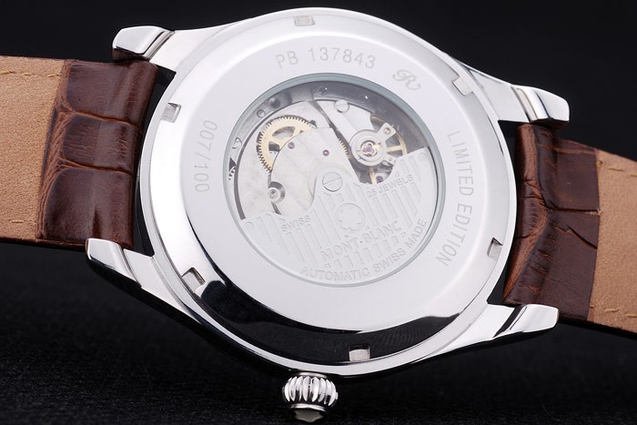 Tillbaka: Polerat rostfritt stål skruvas ned tillbaka med mekanik avslöjar transparenta centrum och Limited Edition engravings