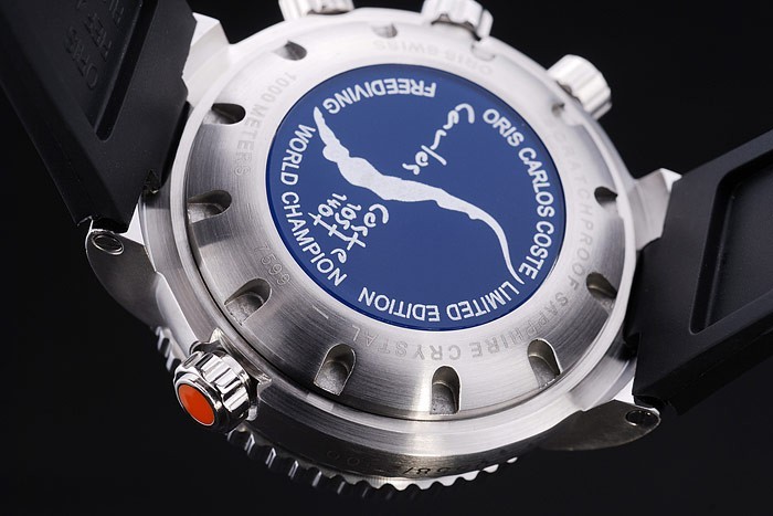 Tillbaka: Rostfritt stål snap-in tillbaka med blå emalj Oris Carlos Coste Limited Edition inskription och logo