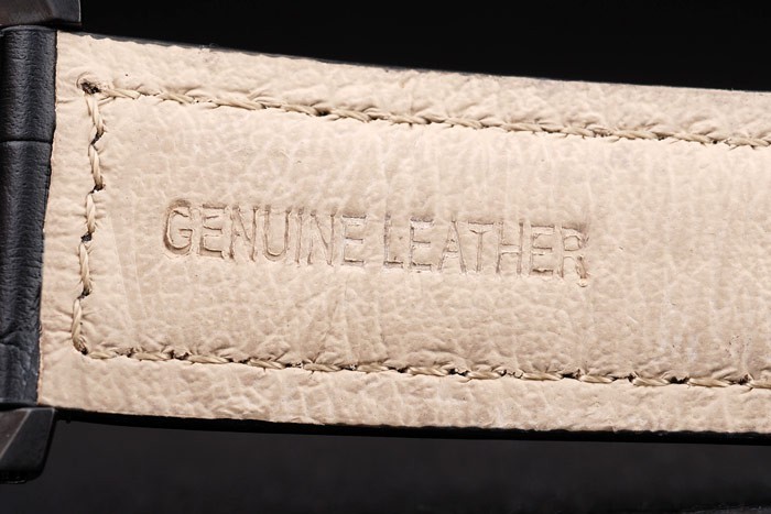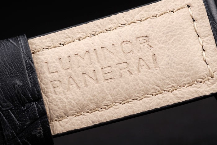 Bracelet: Svart krokodilläderband med vita sömmar och värme präglade Luminor Panerai stämpel och jon-plated rostfritt stål krok spänne spänne med Panerai engraving