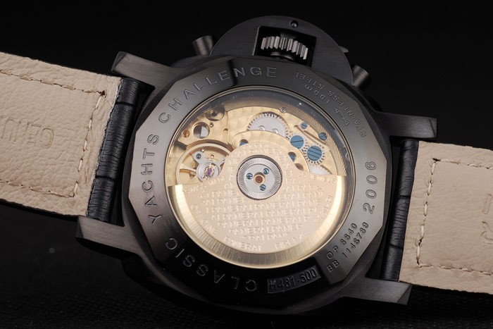 Denna klocka har AR glas. Ansiktet färg visas olika färger beroende på hur ljuset faller på itBack: Ion-plated rostfritt stål kantad transparent snap-in tillbaka med Panerai gravyr