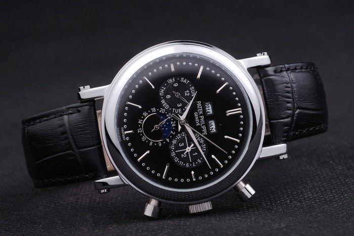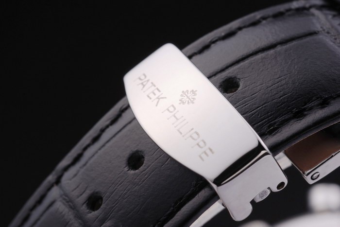 Bracelet rostfritt stål: Svart läderrem med Patek Philippe stämpel och en rostfri gånger i clasp