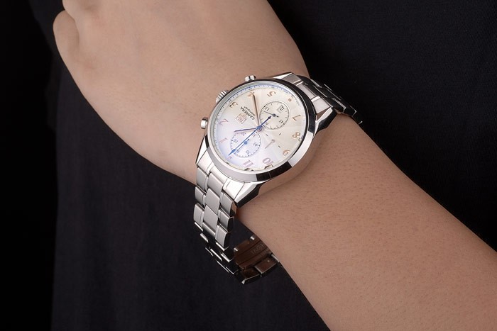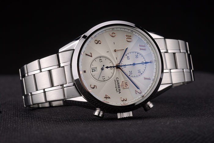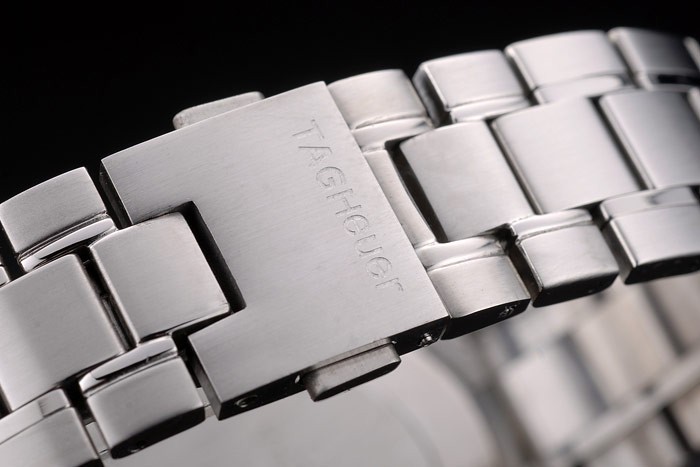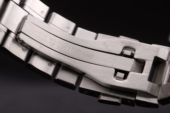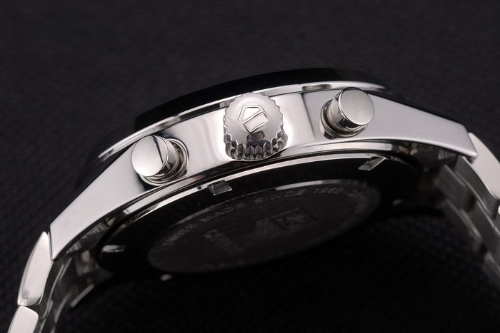 Crown: polerat rostfritt stål cutwork krona med Tag Heuer logotyp och två runda tryckknapp kronor på ömse sidor om it