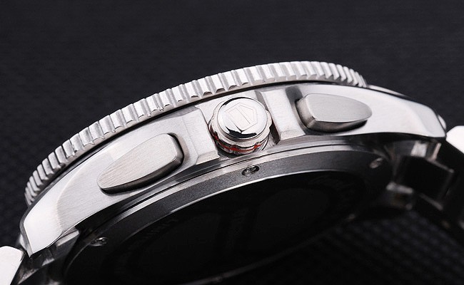 Crown: Polerat rostfritt stål cutwork krona med Tag Heuer logo plus ytterligare två kronor på vardera sidan och en på den motsatta övre corner
