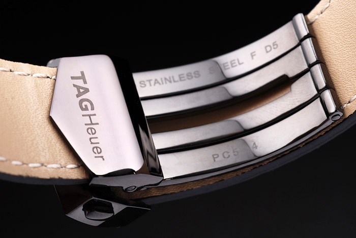 Bracelet: Svart krokodil läderrem med värme präglade stämpel Tag Heuer och jon-klädd tryckaren fold-i lås med Tag Heuer logo på top