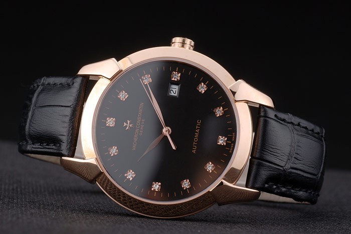 Bracelet: Heat präglade Vacheron Constantin och logotyp svart krokodil läderrem med 18k Rose- guldpläterad logo krok spänne clasp